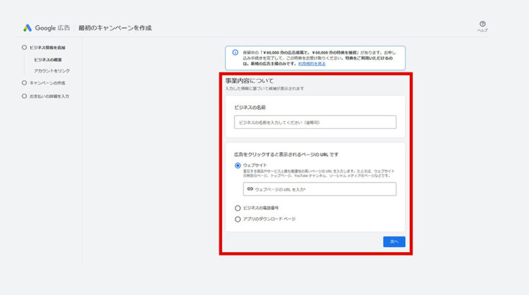 ビジネスの名前・WEBページのURLなどを記入します。