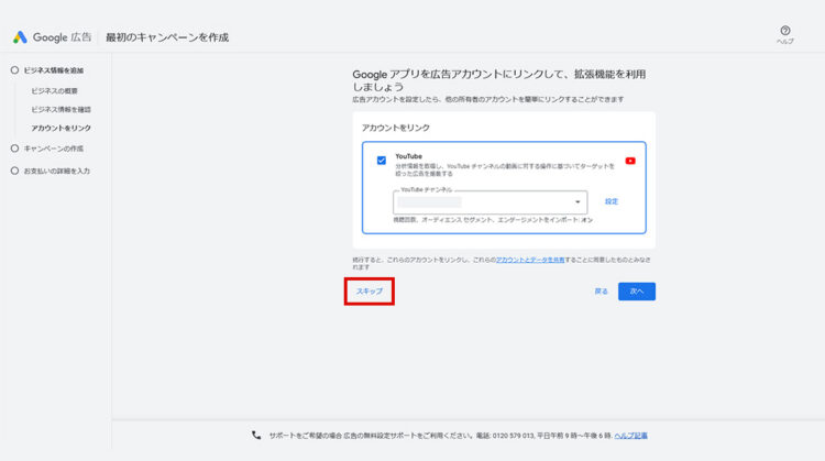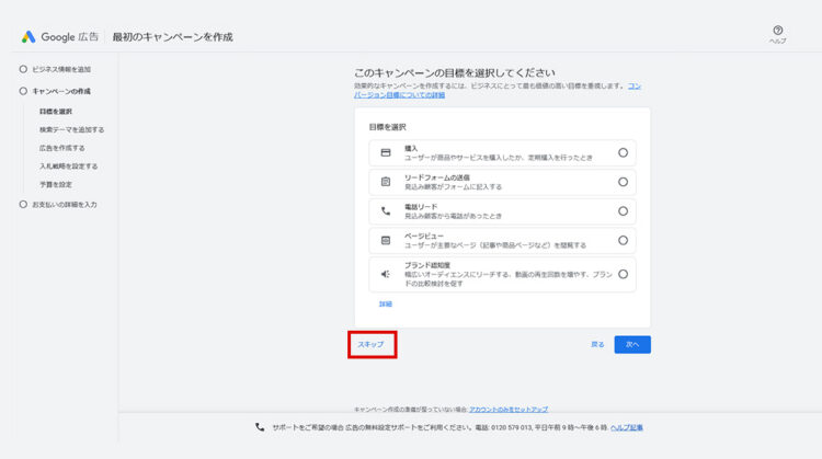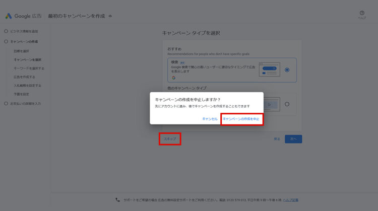 スキップをクリックしてください。画像のように、「キャンペーンの作成を中止」のポップアップが表示されるので、クリックしてください。