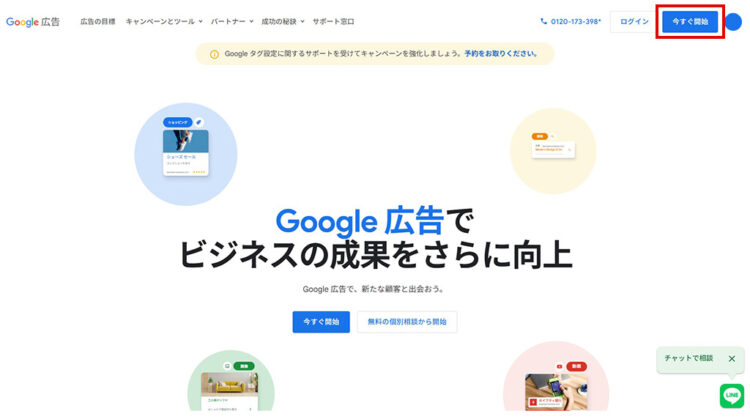 Googleアカウントを持っていれば、Google広告の公式サイトにアクセスして、右上にある「今すぐ開始」ボタンをクリックするだけで簡単に始められます。