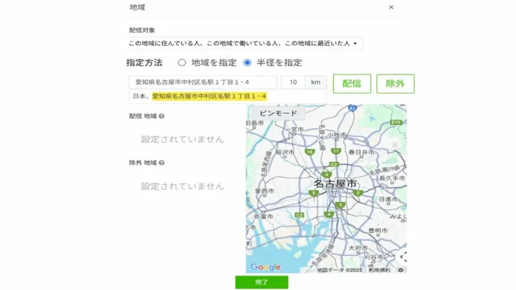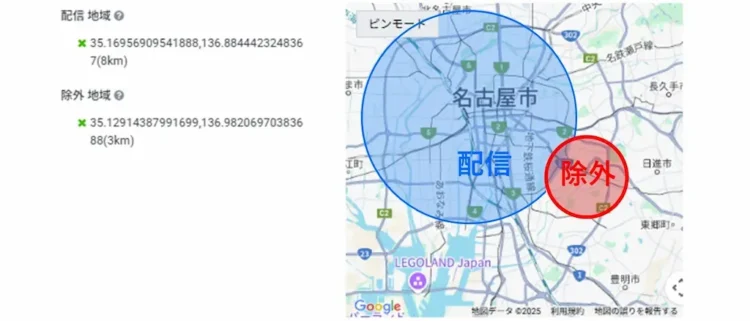 配信する範囲と除外する範囲で円が重なった場合は、除外が優先されます。