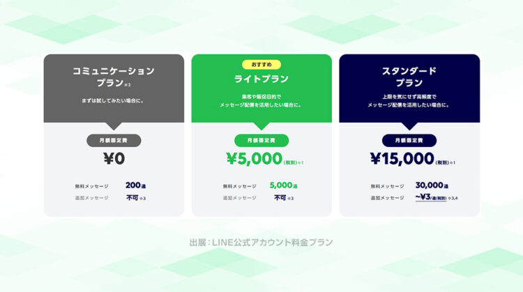 LINE公式アカウントの料金プランは、コミュニケーションプラン・ライトプラン・スタンダードプランの3種類があり、友だち数や配信頻度に応じて最適なプランを選ぶことが大切です。