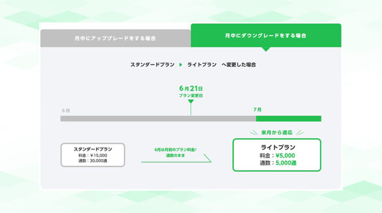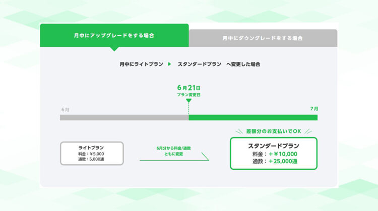 たとえば、3月15日にライトプランからスタンダードプランへ変更した場合、差額を支払うことで3月15日からスタンダードプランが適用され、差分のメッセージ通数も即座に付与されます。