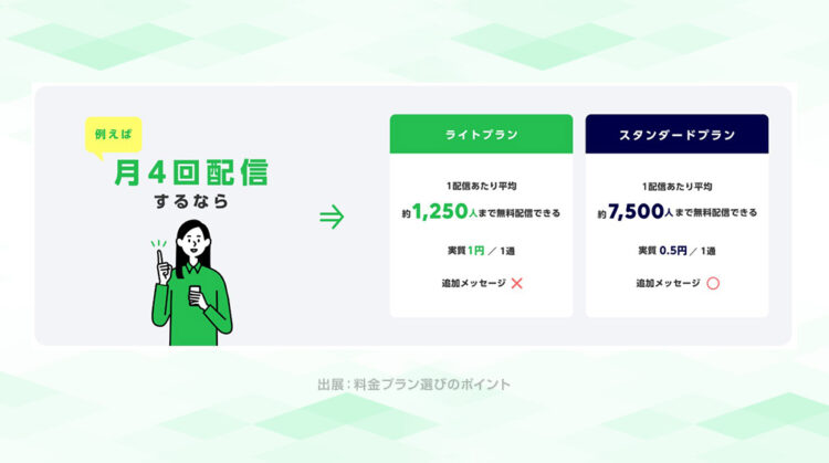 まずは自社がどのくらいの頻度でメッセージを配信したいのかをイメージしながら、各プランの詳細を見ていきましょう。