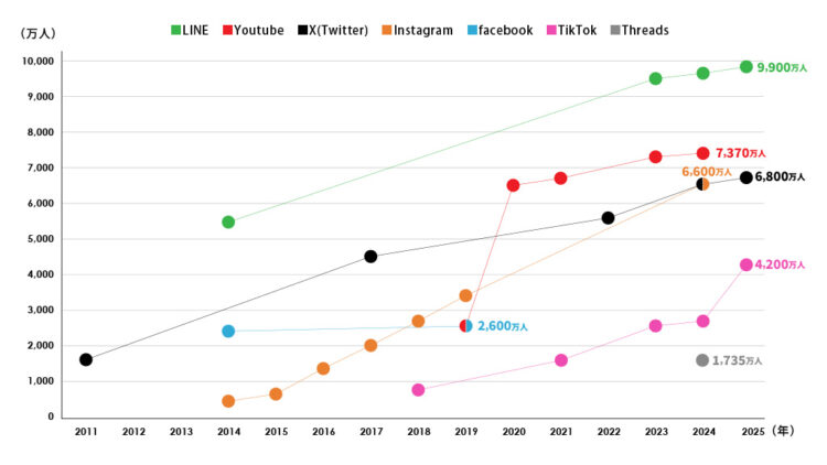 今回の記事では、日本国内で主要なSNSであるLINE、YouTube、X(Twitter)、Instagram、Facebook、TikTok、Threadsの利用者数の推移を調査しました。